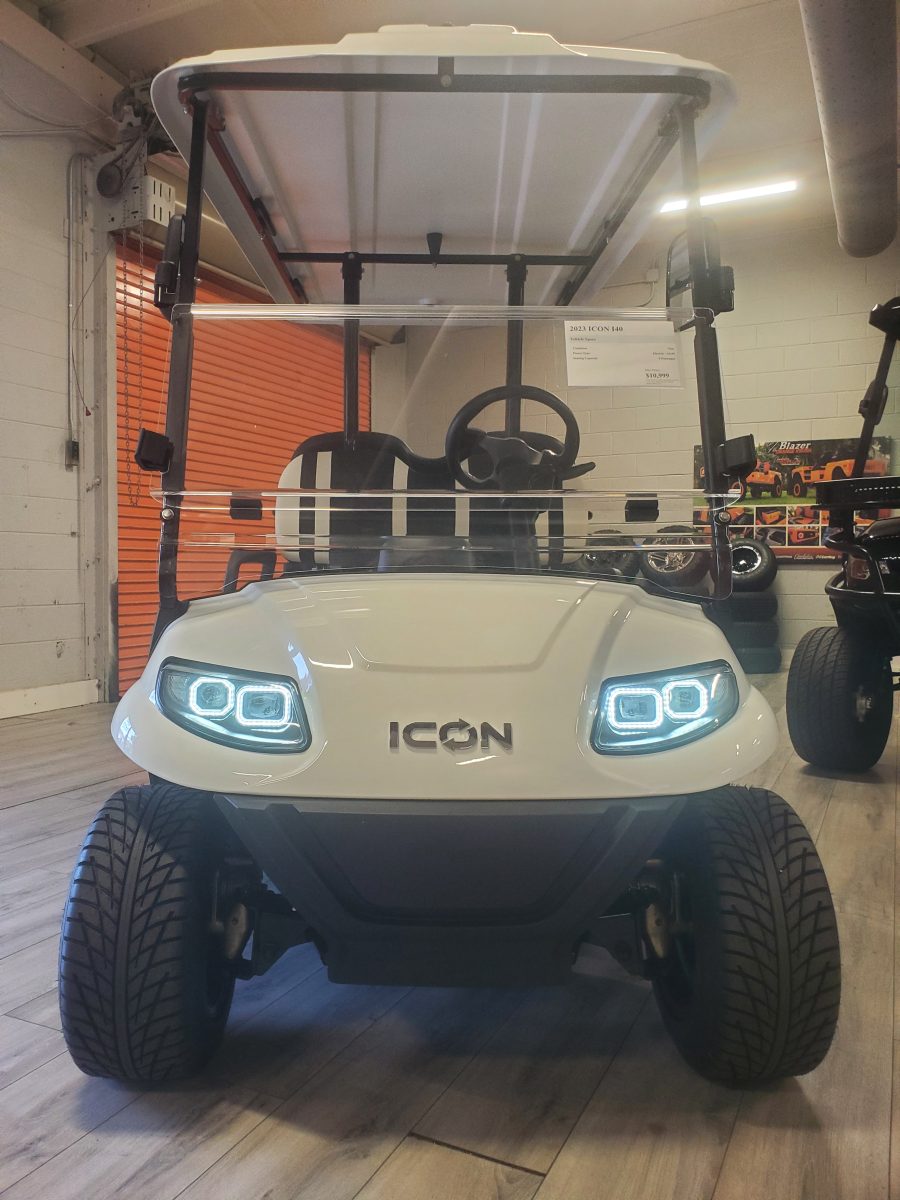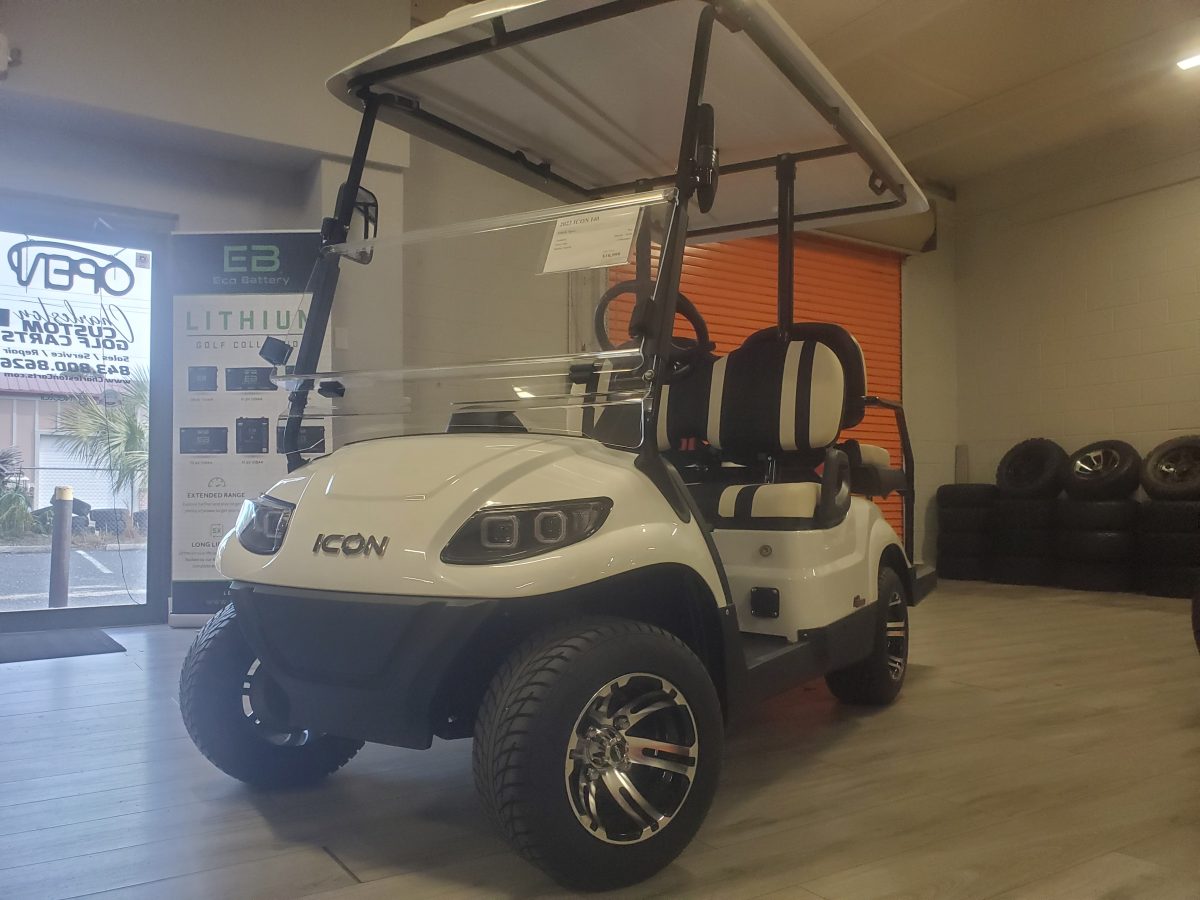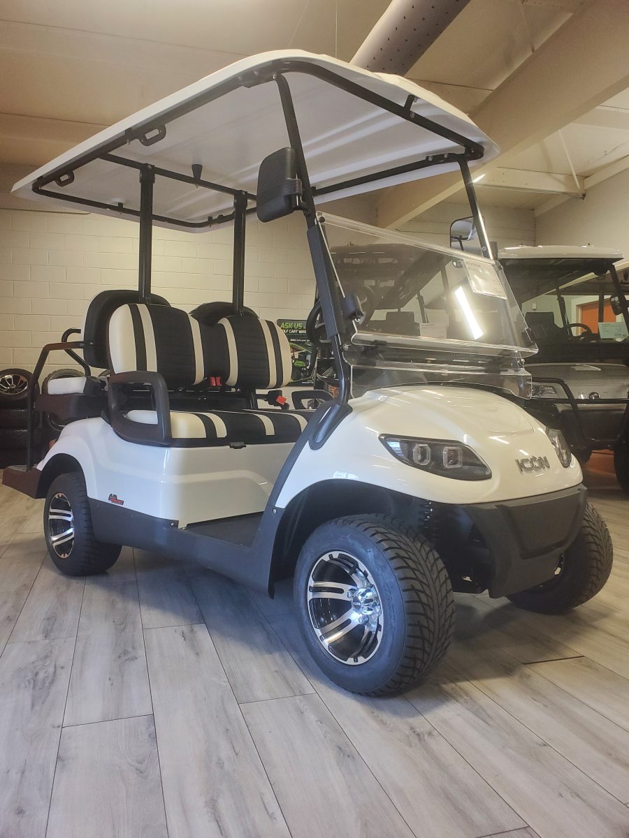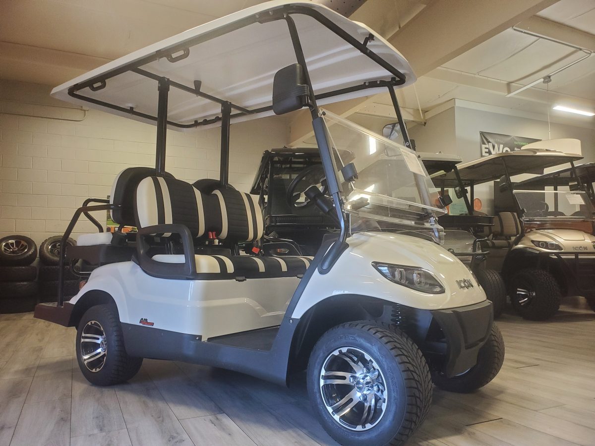 The ICON i40 four-seater golf cart/ Low Speed Vehicle is the epitome of perfection when it comes to residential and commercial needs. Whether you’re taking your friends to lunch or transporting potential clients’, this golf cart/ Low Speed Vehicle is stylish and extremely comfortable. Plus, it’s loaded with premium features like 10″ aluminum wheels, 4-wheel disc brakes, powder-coated steel chassis, lights, turn signals, high-speed rear ends, durable front and rear bumpers, painted rooftops, horns, digital gauges, and more!